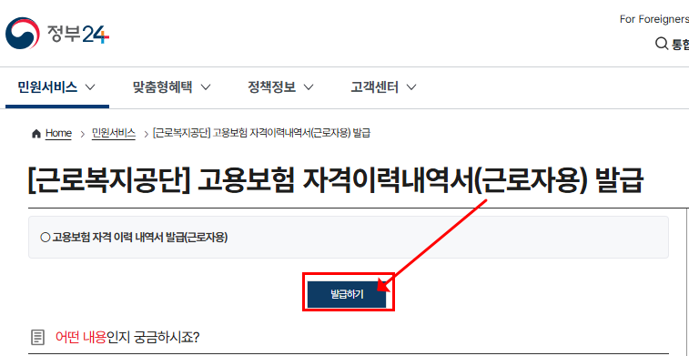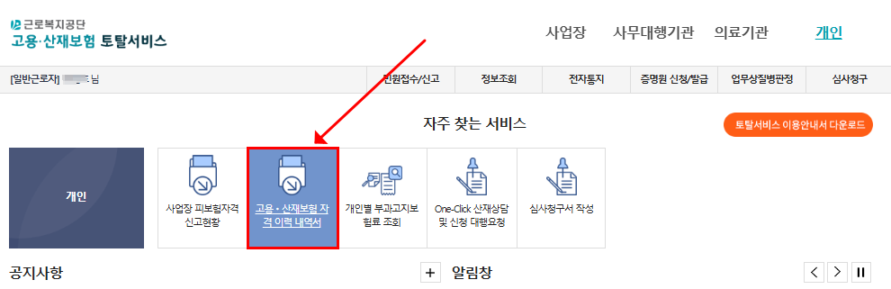 '개인서비스' → '고용보험' → '가입이력조회' 클릭